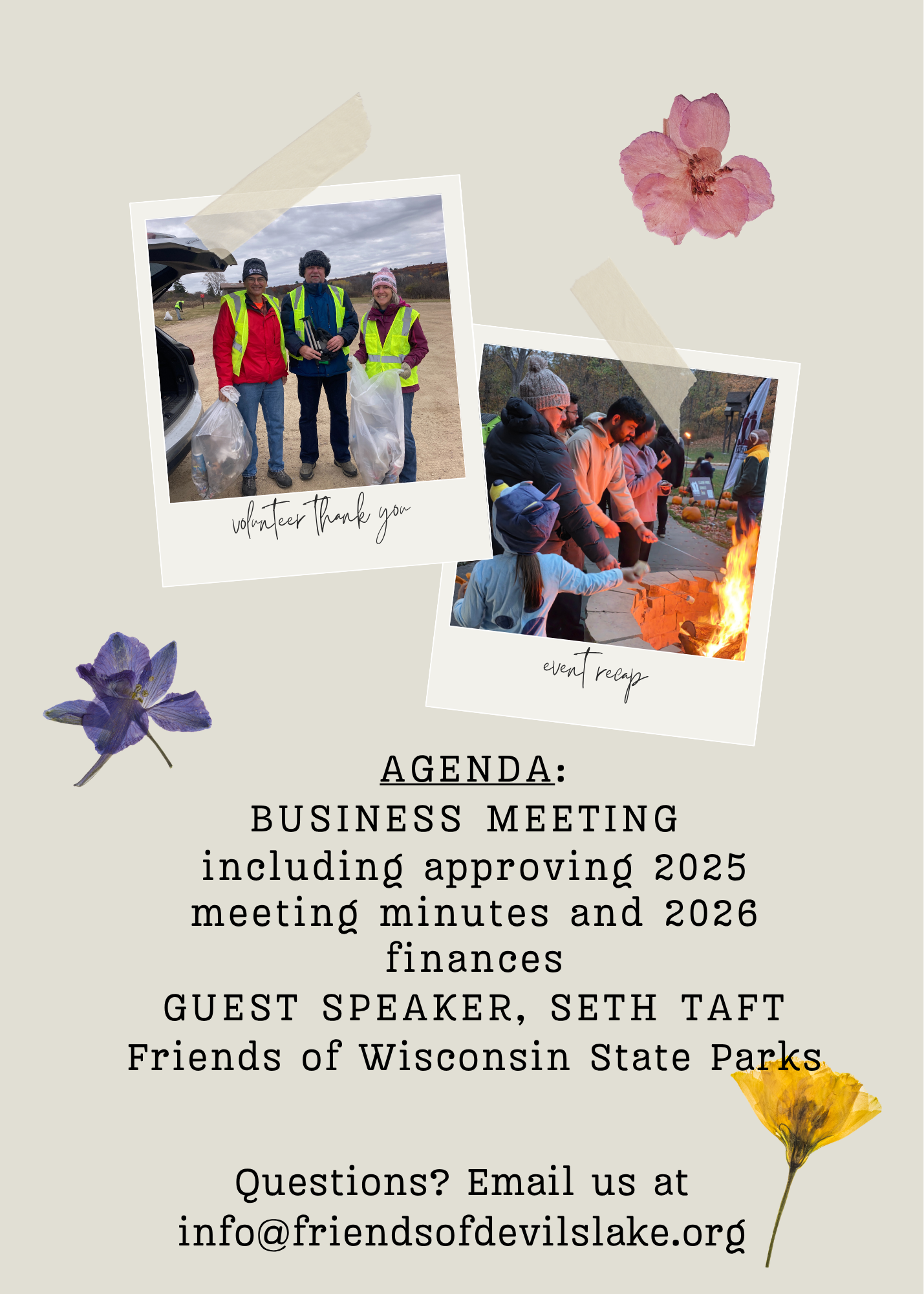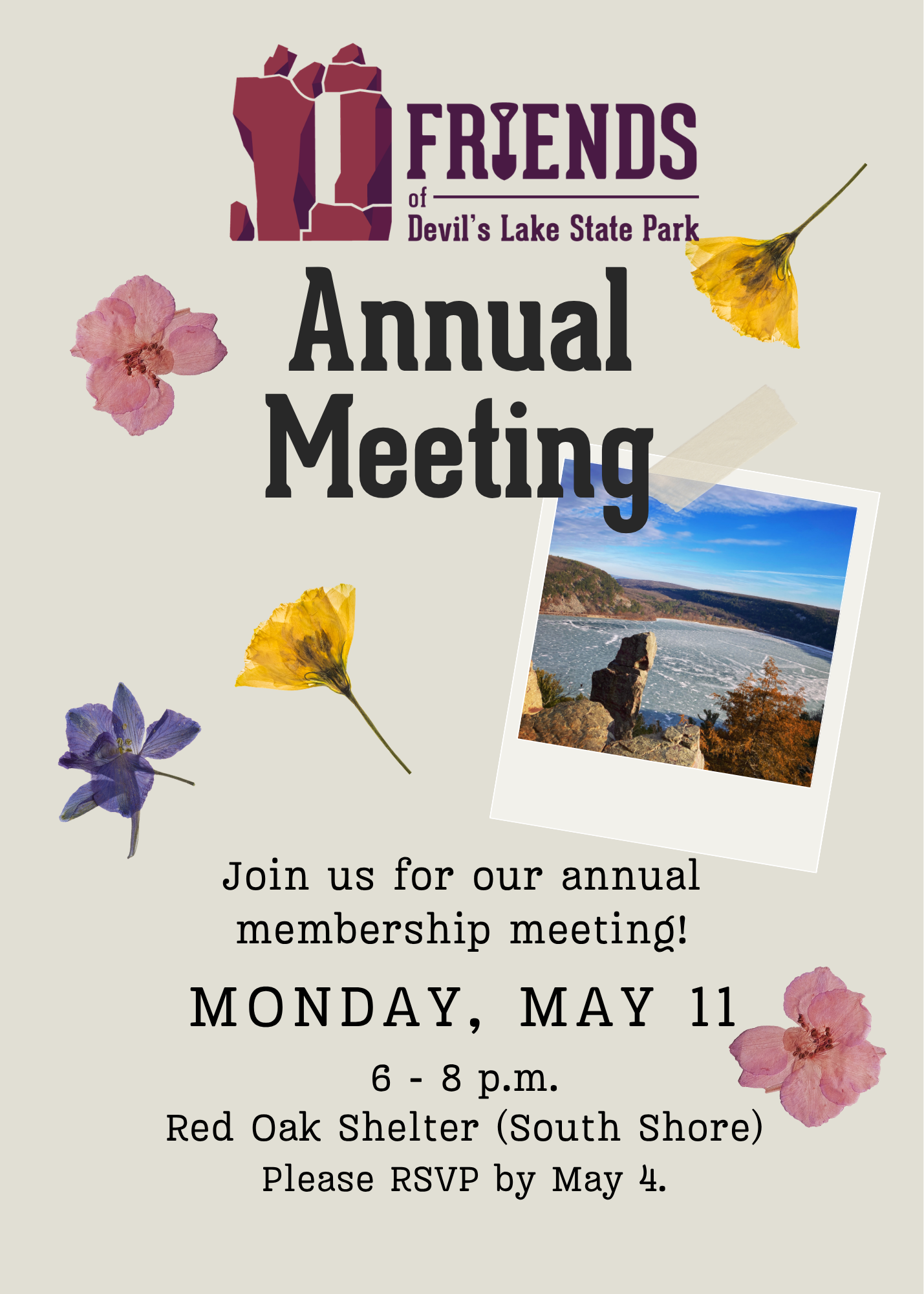 Friends of Devil's Lake Annual Members Meeting Monday, May 11, 2026 6:00 PM 8:00 PM Devil's Lake State Park S5975 Park Road Baraboo, WI, 53913 United States (map) Google Calendar ICS RSVP HERE